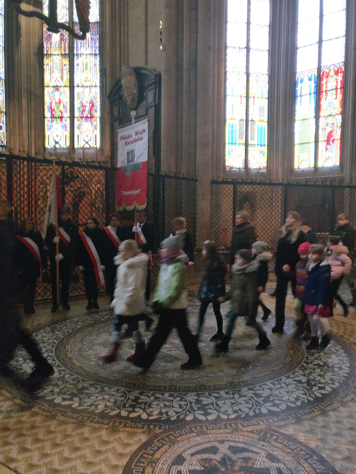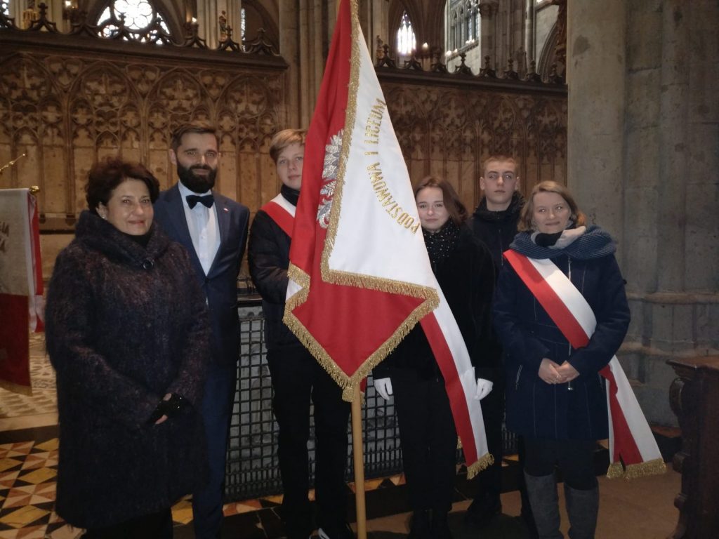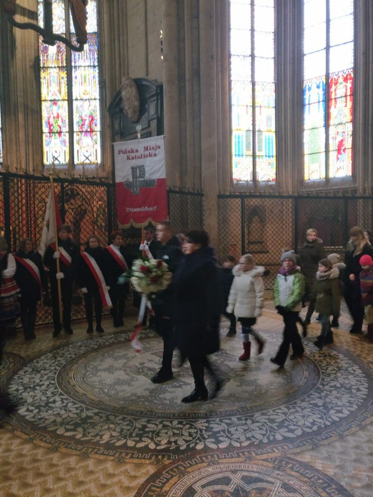 Udział wzięli: Konsul Generalny RP w Kolonii Pan Jakub Wawrzyniak, Konsul Polonijny pan Aleksander Gowin, pracownicy Konsulatu Generalnego RP w Kolonii, przedstawiciele Wojska Polskiego na czele z Pułkownikiem Panem Krzysztofem Przybylskim, Kierownik SPK w Kolonii Pani Jolanta Pulińska-Meryng wraz z gronem pedagogicznym, uczniami i rodzicami. Nasza szkoła wprowadziła na uroczystość poczet sztandarowy z wizerunkiem patronki.