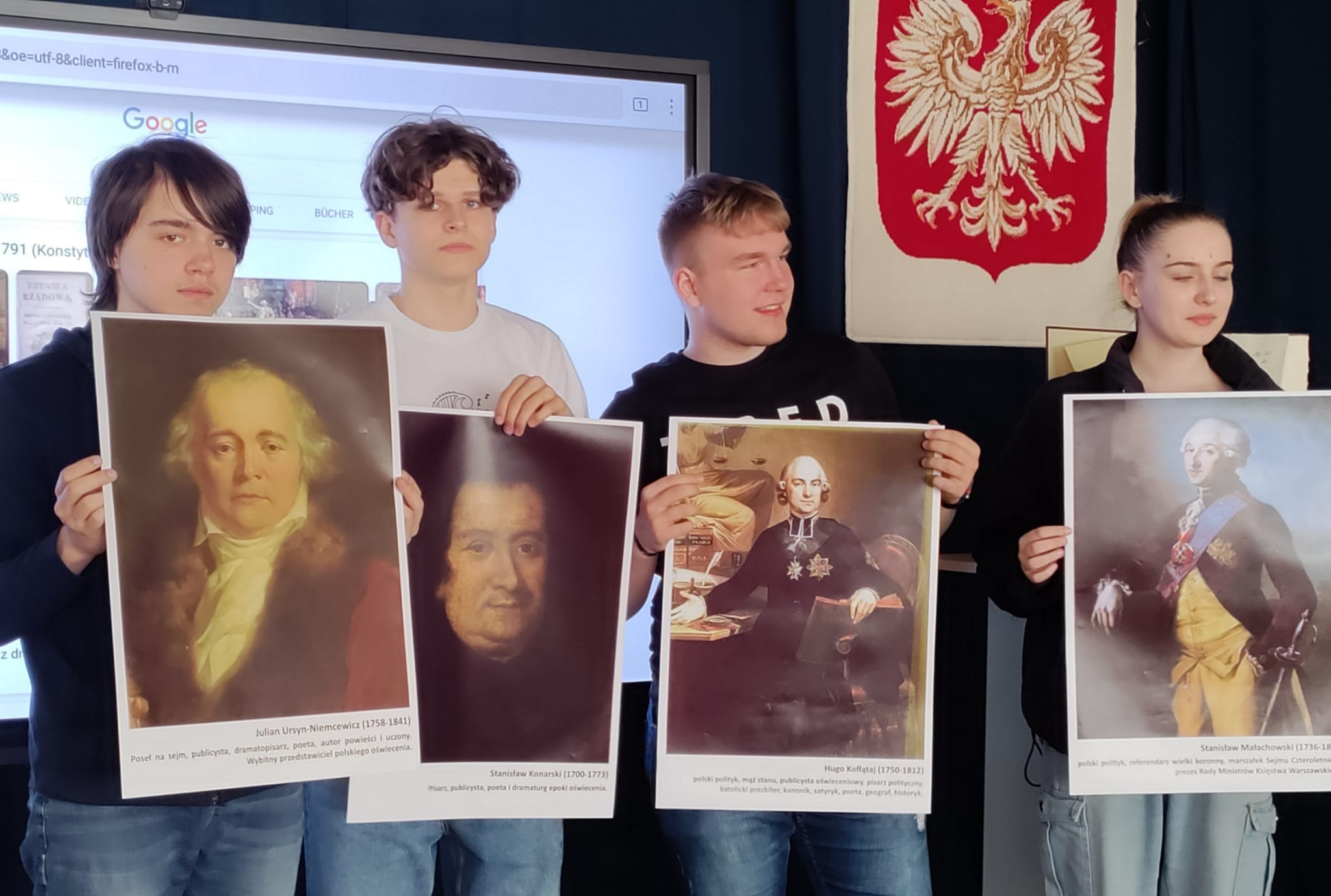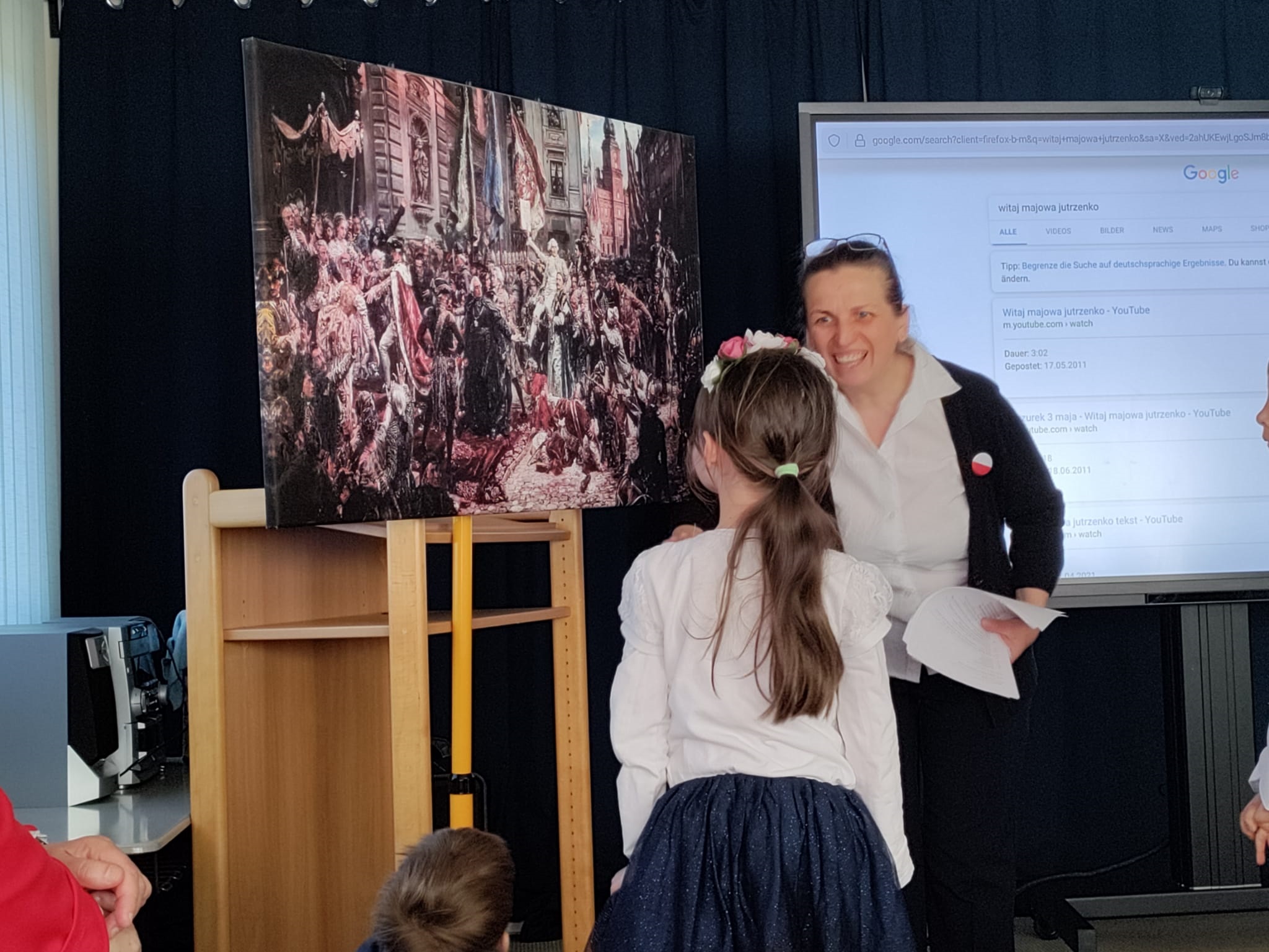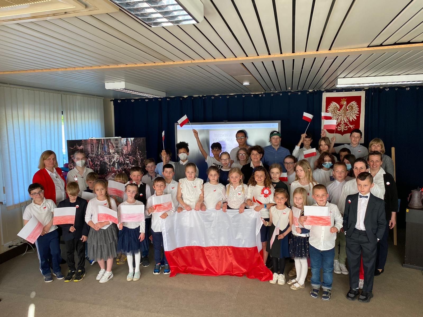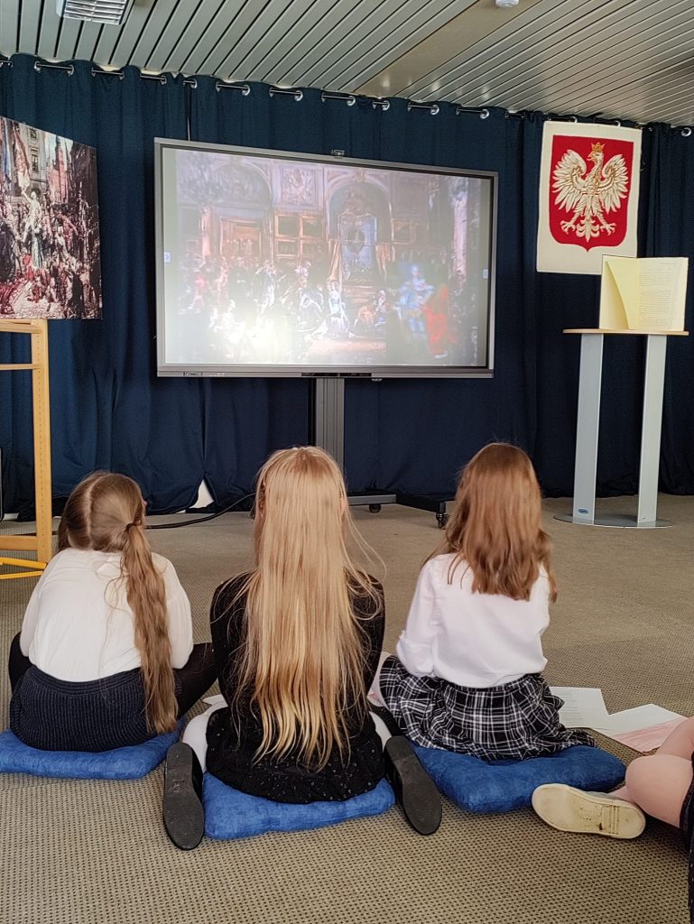 Cała społeczność szkolna spotkała się w auli na prezentacji ważnych wydarzeń związanych z majowymi obchodami.