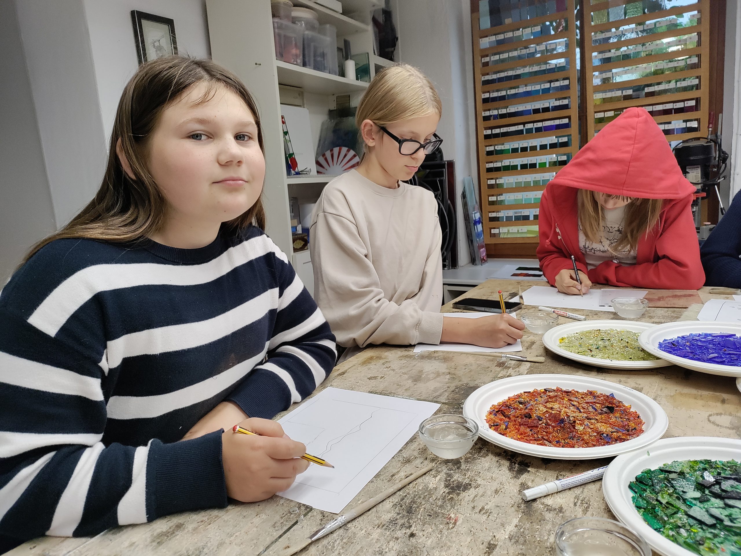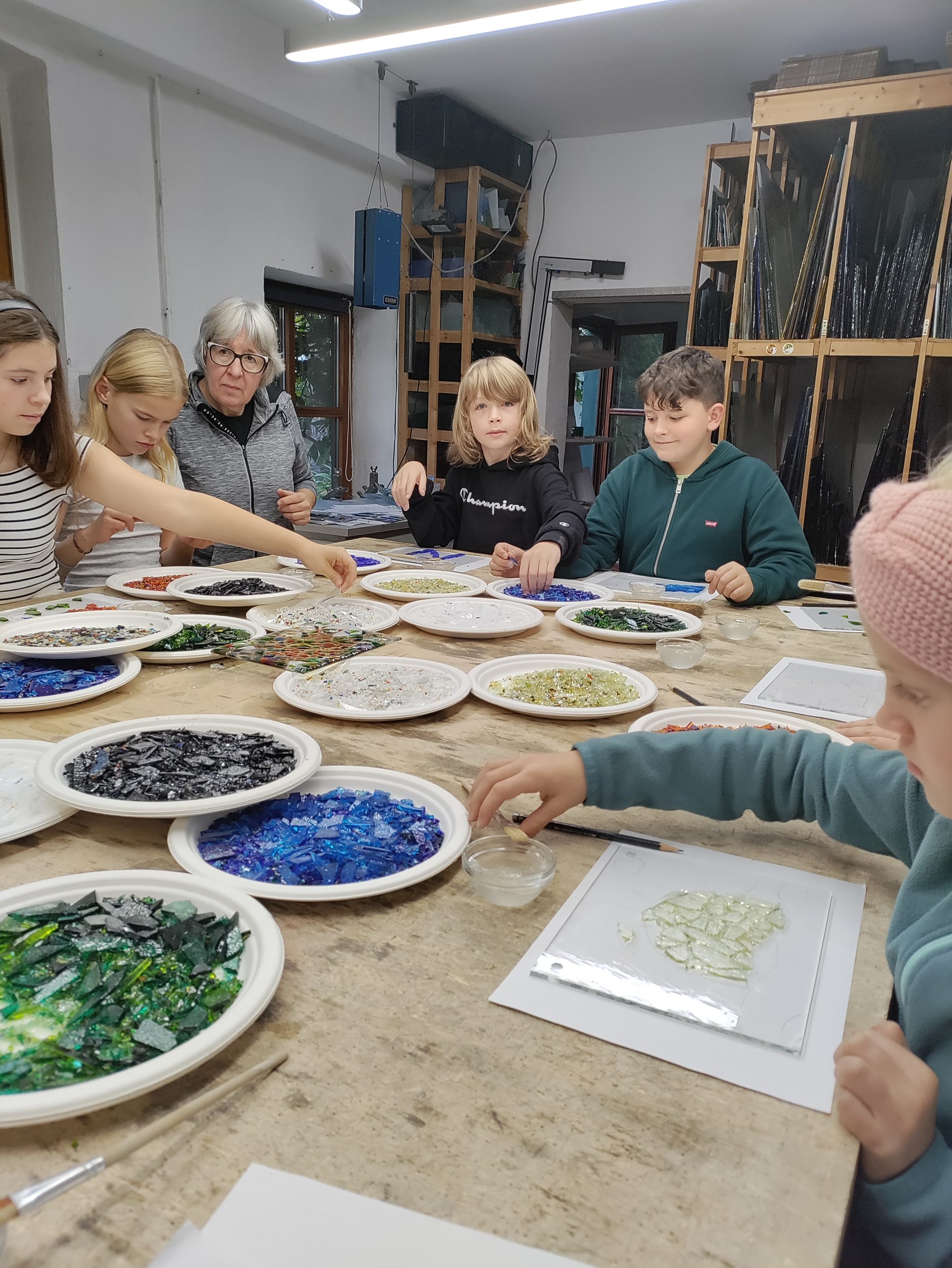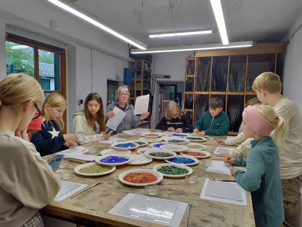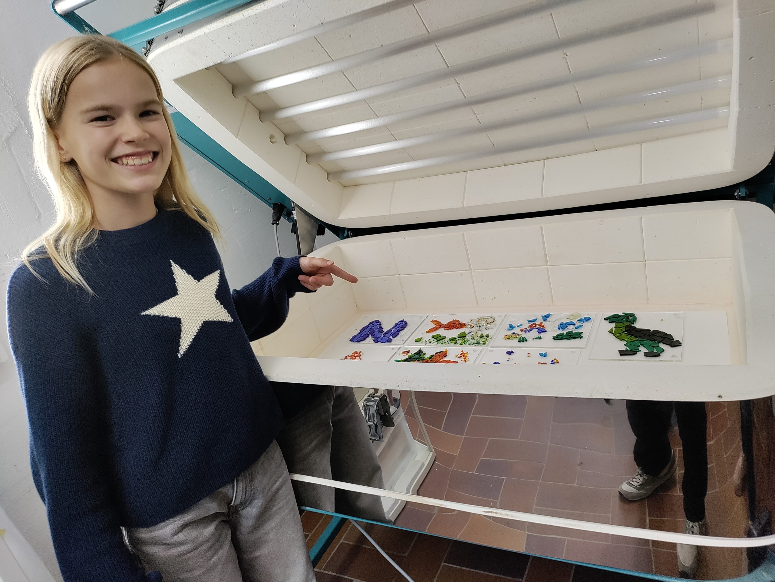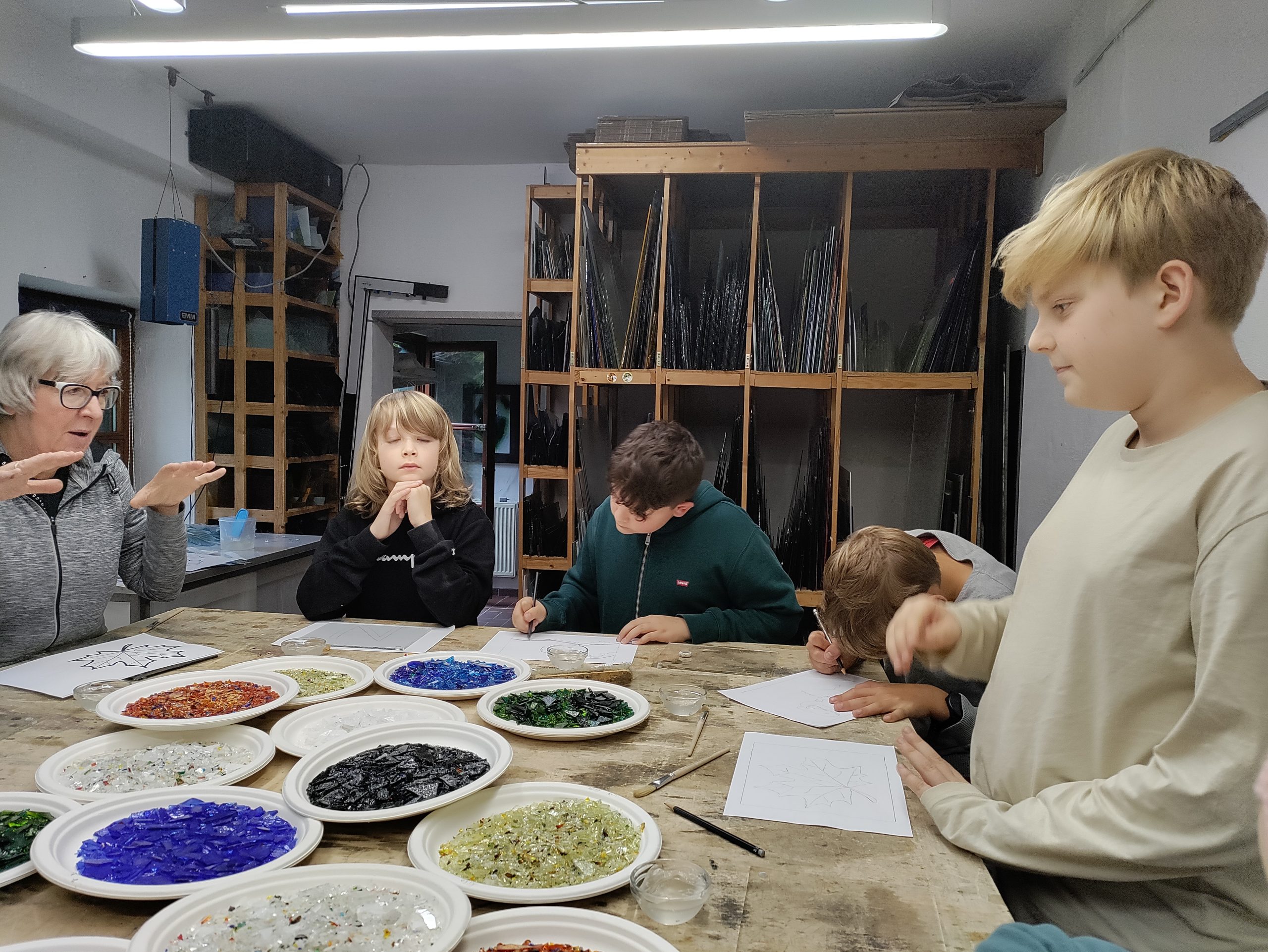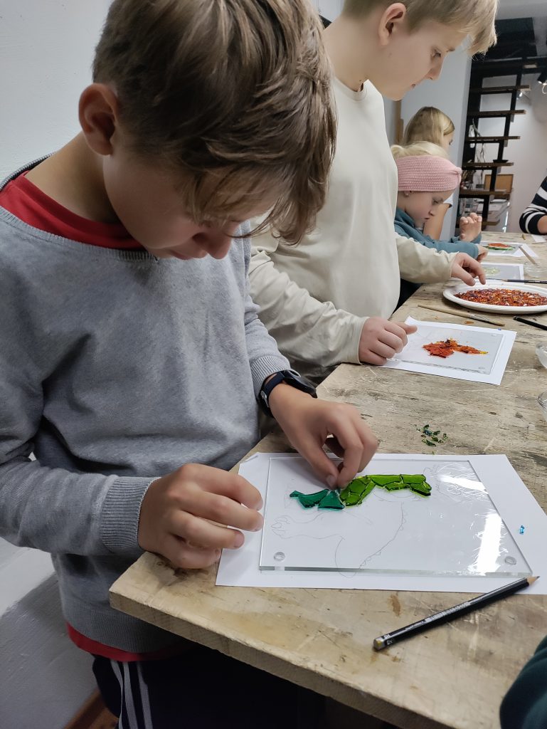 Nie tylko podziwialiśmy piękne rzemiosło, ale również sami wykonaliśmy nasze szklane prace, które pani Feuser Stradas wypaliła w piecu, tworząc z naszych mozaik wyjątkowe obrazki będące efektem celowego zbiegu kolorystycznych okoliczności.