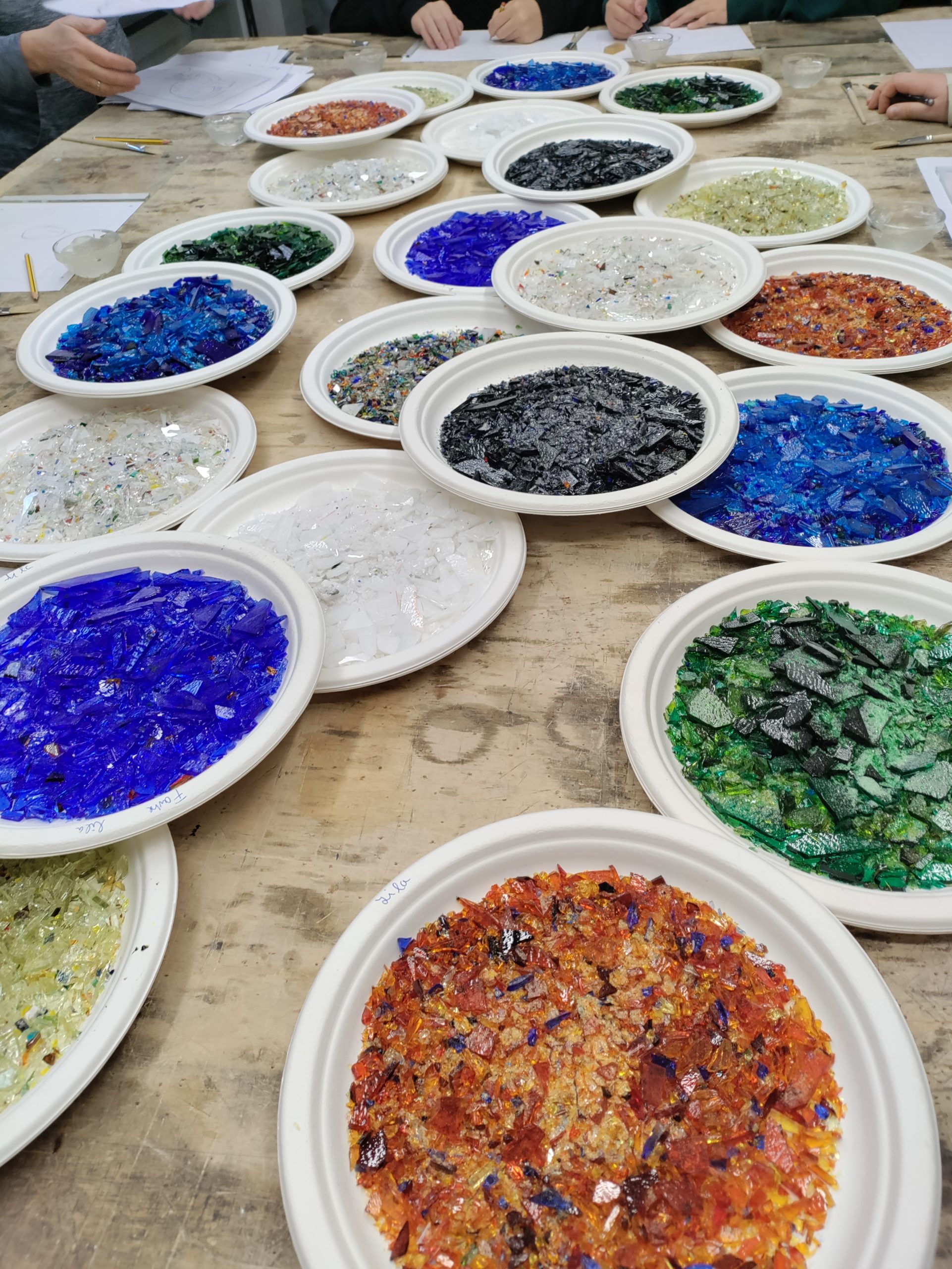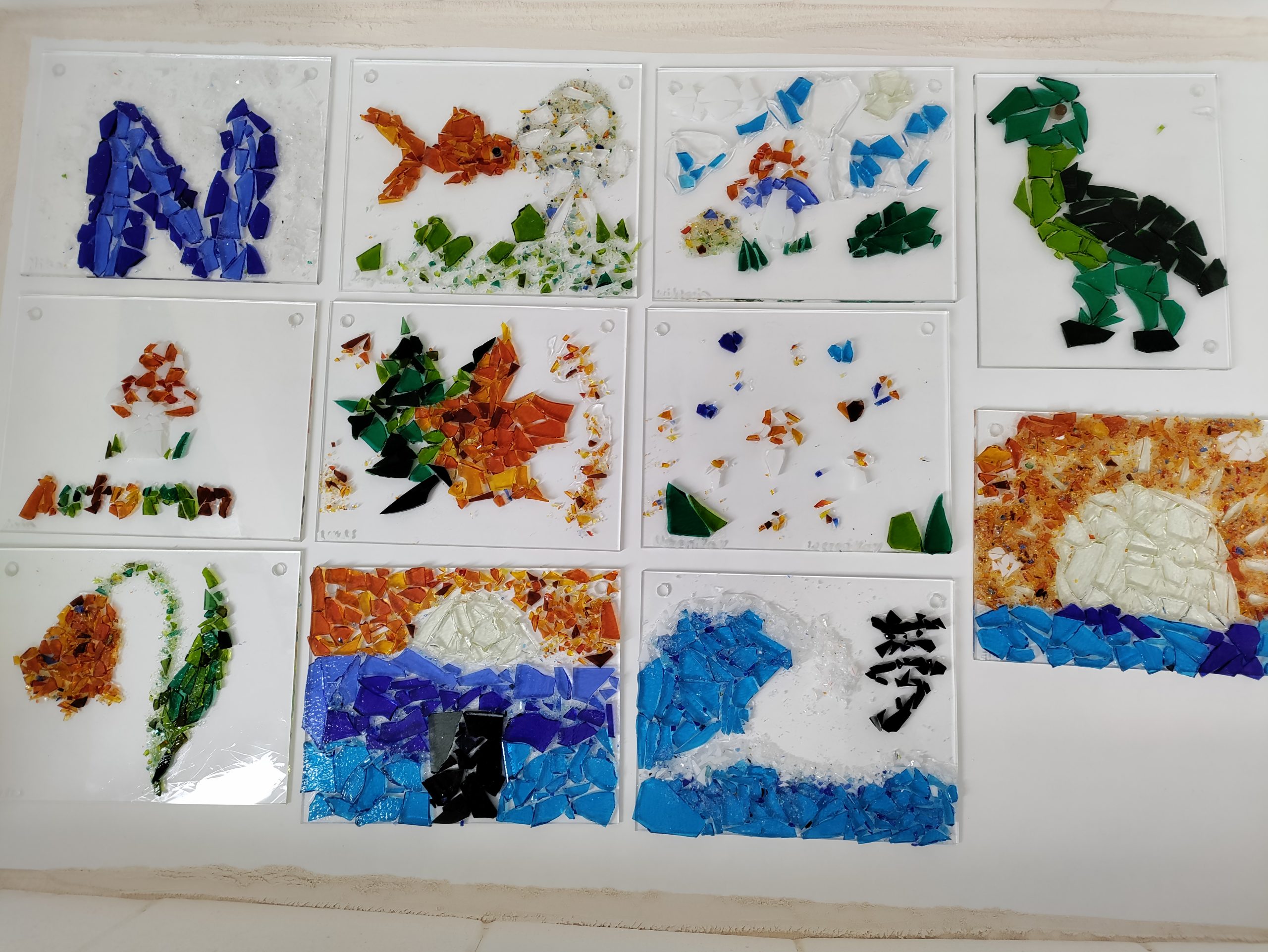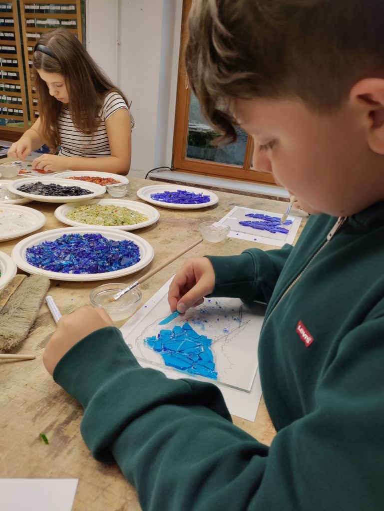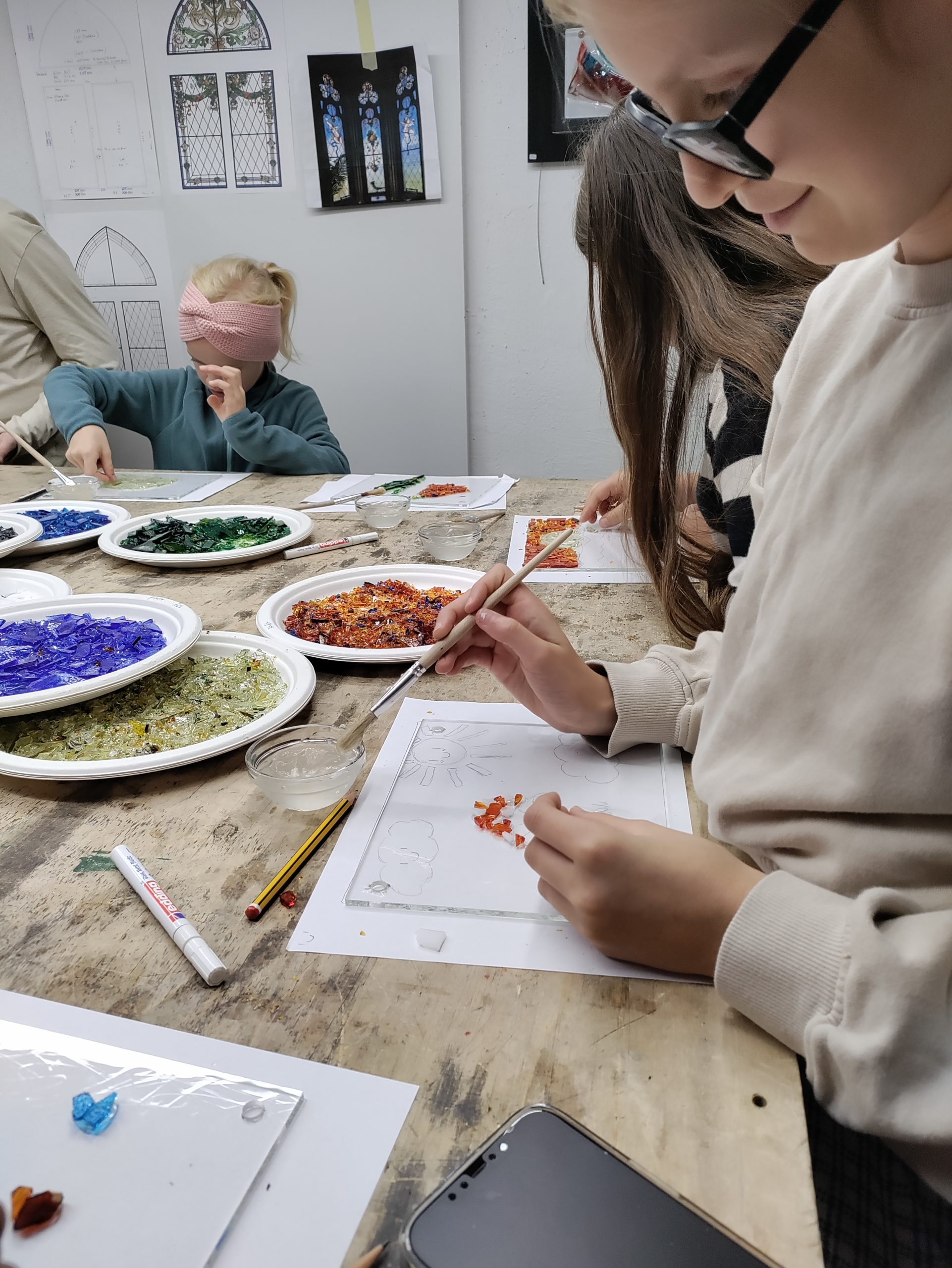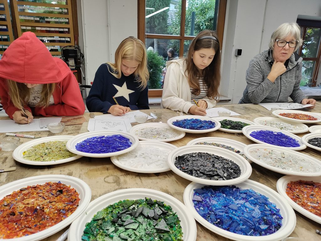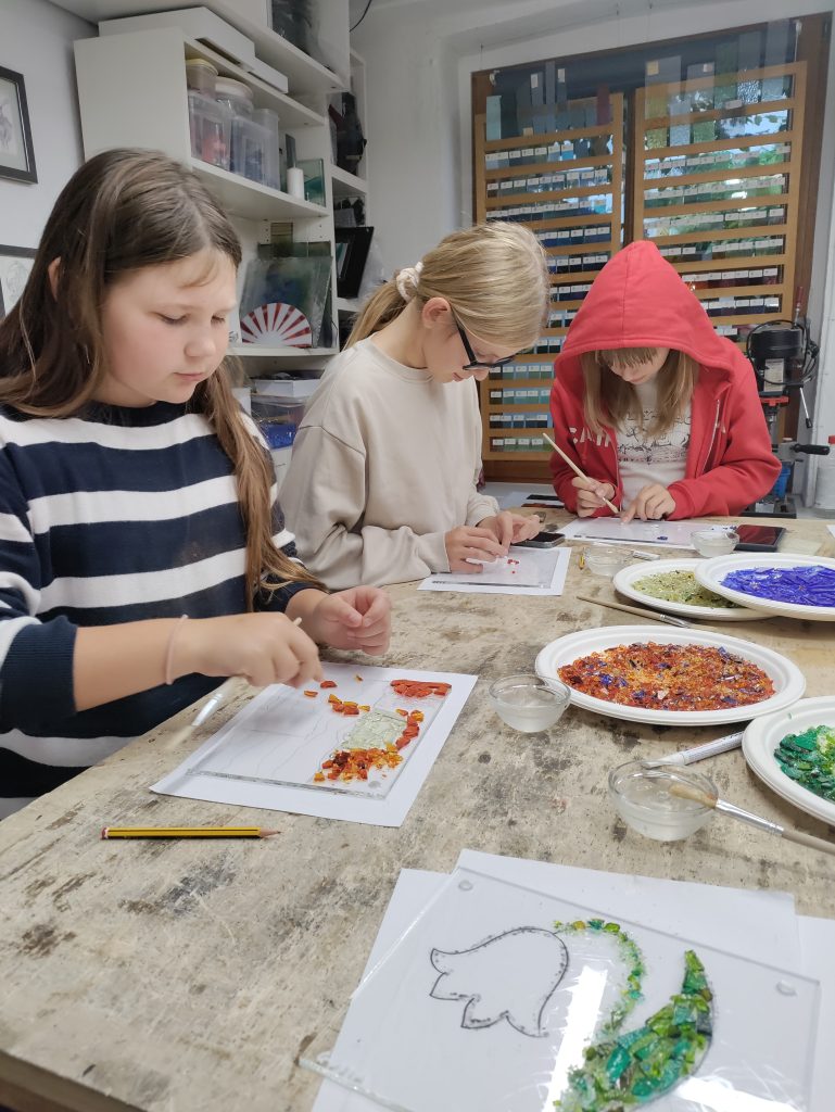 Nie tylko podziwialiśmy piękne rzemiosło, ale również sami wykonaliśmy nasze szklane prace, które pani Feuser Stradas wypaliła w piecu, tworząc z naszych mozaik wyjątkowe obrazki będące efektem celowego zbiegu kolorystycznych okoliczności.