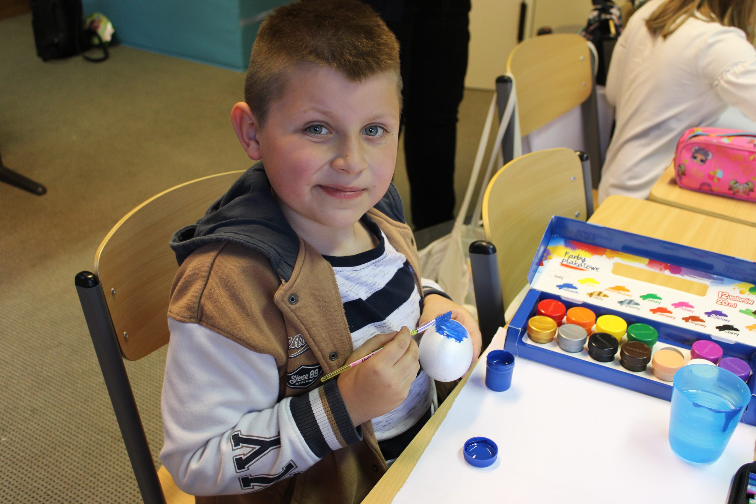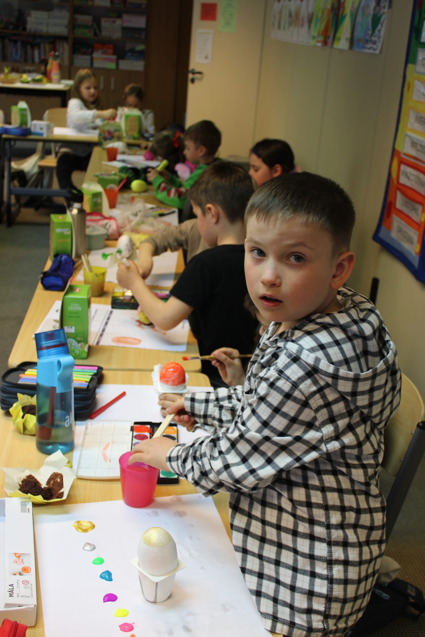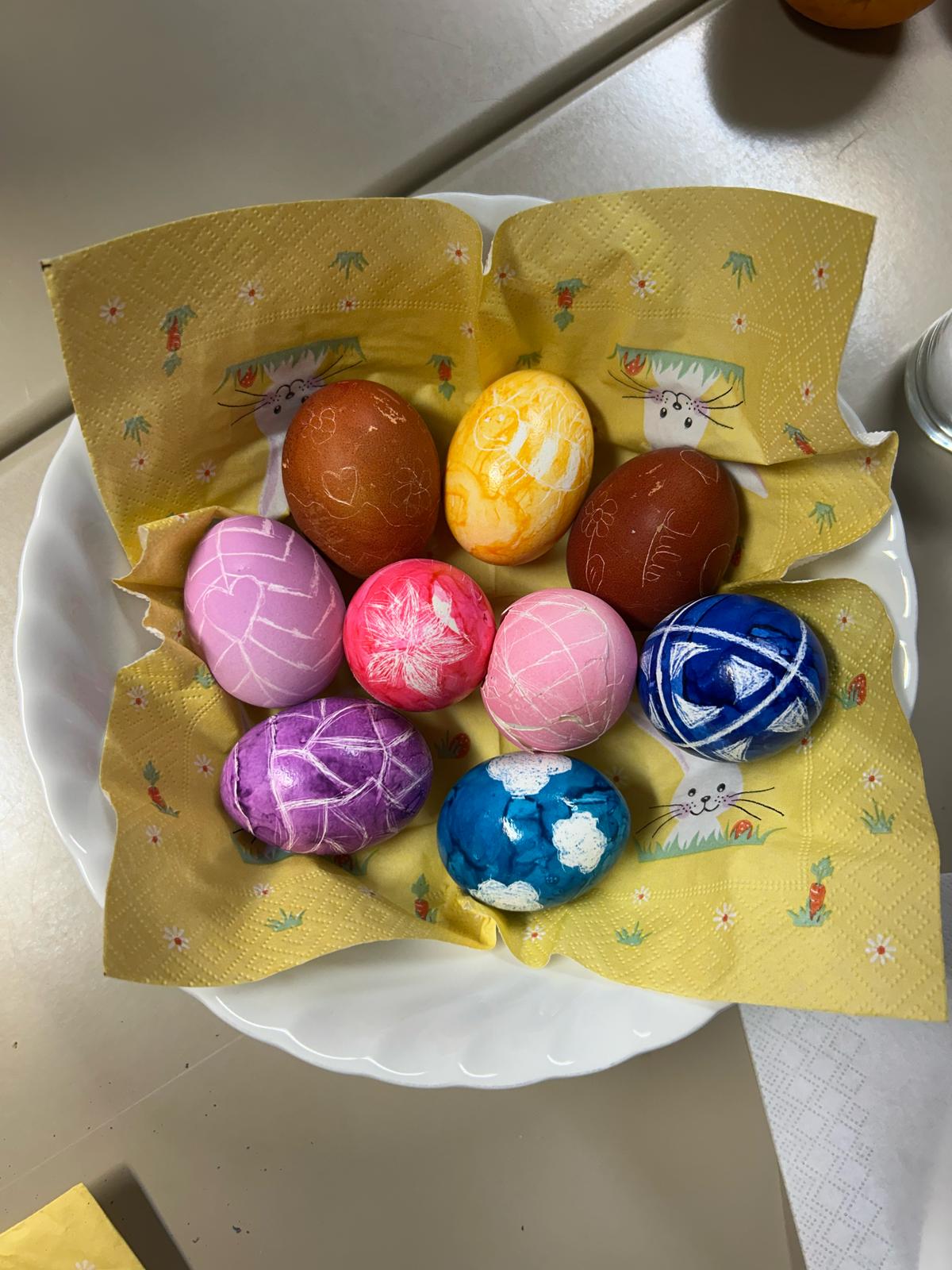 Nie zabrakło również tradycyjnego malowania jajek. Uczniowie poznali różne techniki ozdabiania pisanek, m.in. barwienie naturalnymi składnikami, malowanie farbami oraz wyklejanie. Starsi uczniowie z liceum mieli okazję spróbować bardziej wymagającej techniki – zdobili jajka metodą wydrapywania wzorów, co wymagało dużej precyzji i cierpliwości.