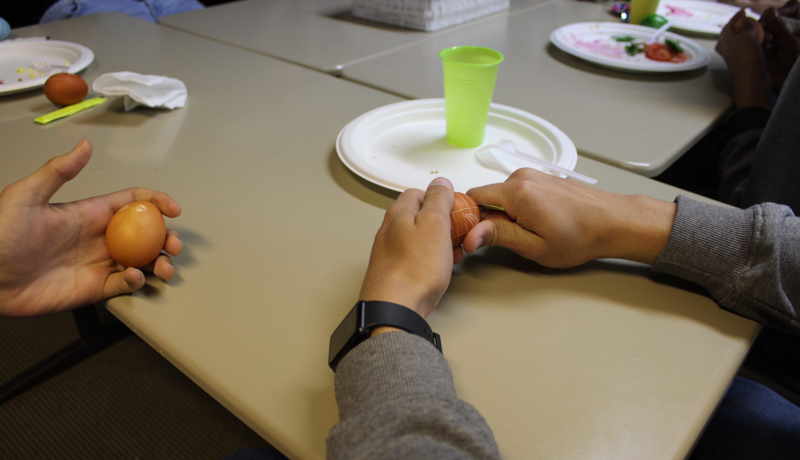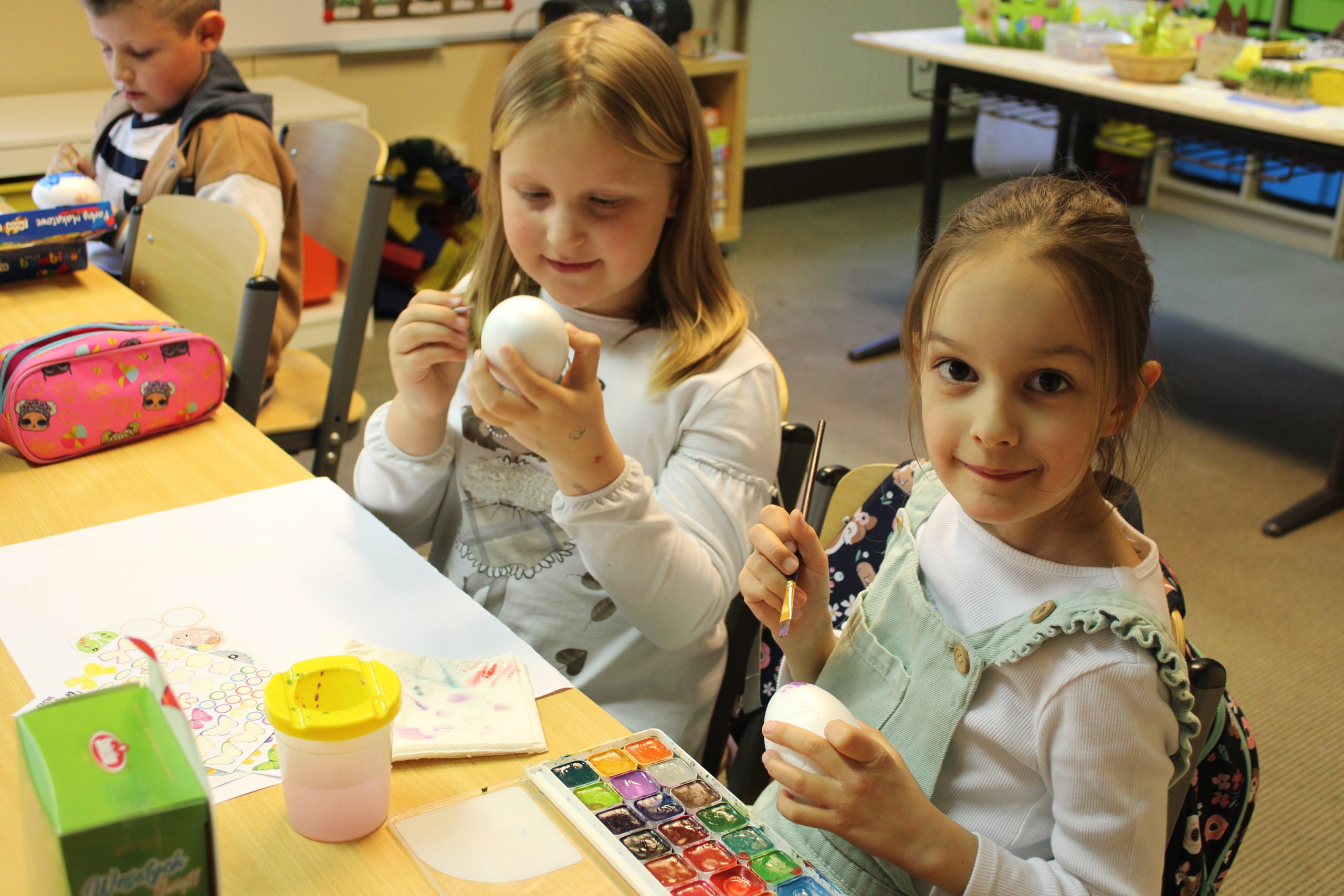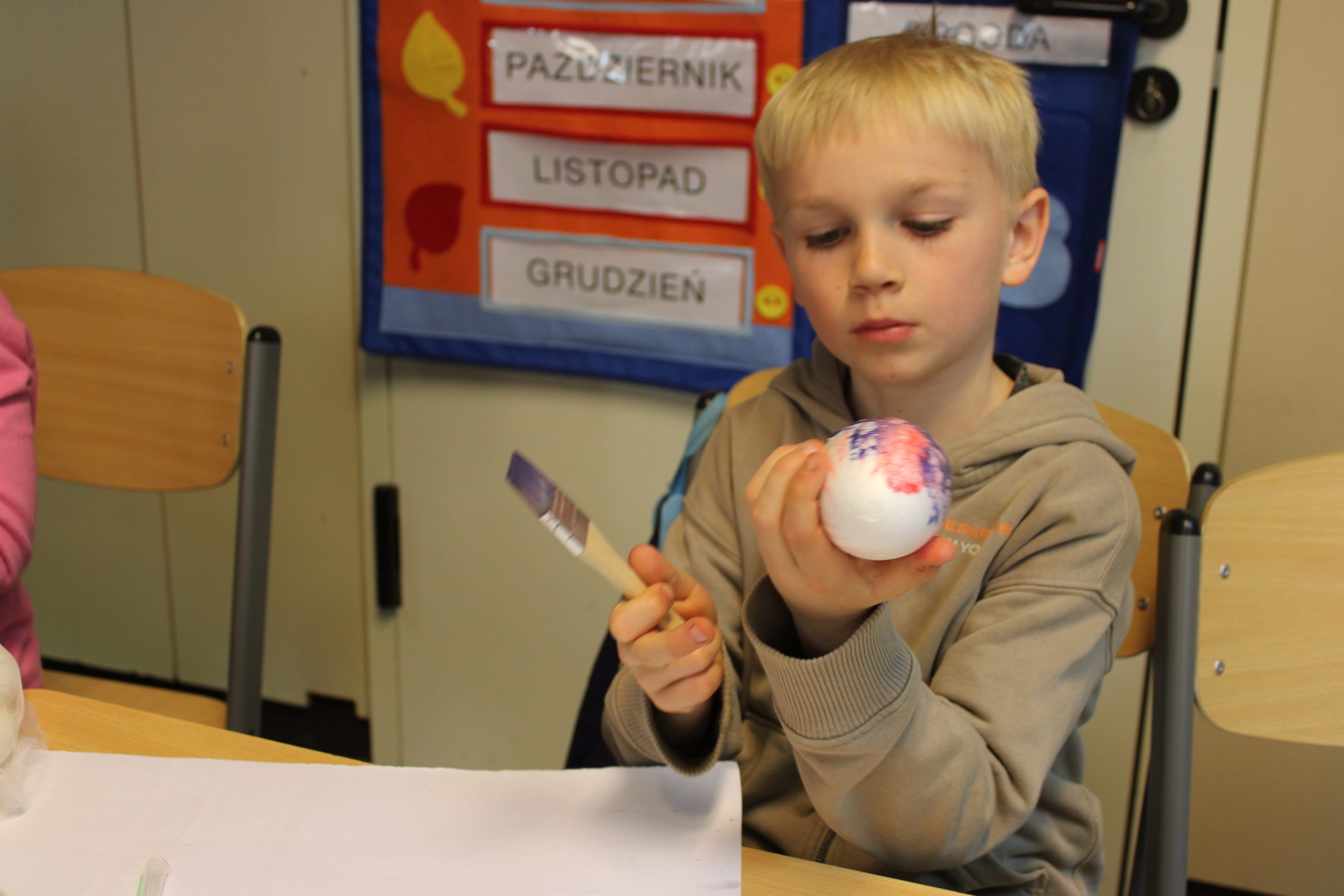 Nie zabrakło również tradycyjnego malowania jajek. Uczniowie poznali różne techniki ozdabiania pisanek, m.in. barwienie naturalnymi składnikami, malowanie farbami oraz wyklejanie. Starsi uczniowie z liceum mieli okazję spróbować bardziej wymagającej techniki – zdobili jajka metodą wydrapywania wzorów, co wymagało dużej precyzji i cierpliwości.