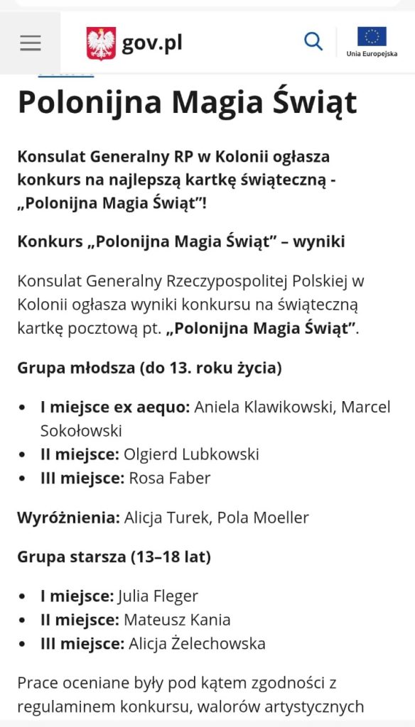 Z radością informujemy o sukcesie naszego ucznia w konkursie zorganizowanym przez Konsulat Generalny RP w Kolonii pt. „Polonijna magia świąt”.